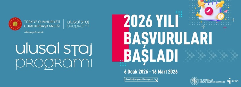 Cumhurbaşkanlığı Himayelerinde Türkiye İş Kurumu (İŞKUR) koordinasyonunda 2026 yılı “Ulusal Staj Programı” öğrenci başvuruları 06 Ocak 2026 tarihinde başlamış olup 16 Mart 2026 tarihine kadar devam edecektir.